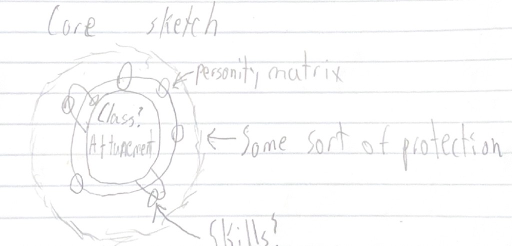 Core — At the center there’s something like identity or class. In my notes I’ve been writing “Class?” and “Attunement!” there—the question mark because I’m still deciding how fixed or flexible the core should be. Attunement feels like the anchor: what the entity is at a fundamental level, before the personality layer does its thing.